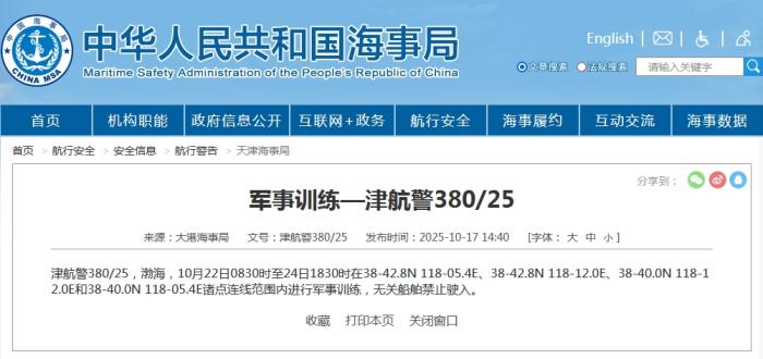 航行警告!渤海部分海域进行军事训练 禁止驶入 中国新闻网 2025-10-22 10:52 68609 中新网10月22日电 据中国海事局网站消息,大港海事局发布航行警告,10月22日8时30分至24日18时30分,渤海部分海域进行军事训练,无关船舶禁止驶入。中国海事局网站截图 评论 2 静天 2025-10-22 发表于四川 强大的祖国 逗比吶你在哪 2025-10-22 发表于四川 国强则民安 我要评论