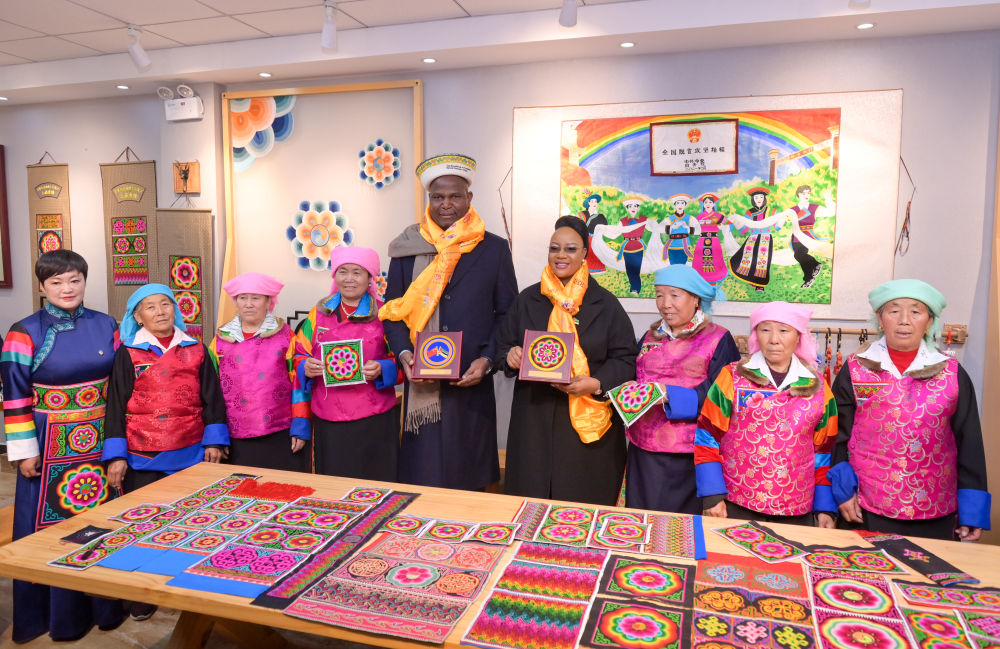 查波拿起盘绣成品细看,色彩明艳,针脚密实,工艺十分精巧。当得知园内的绣娘在家门口就能月入一两千元时,查波频频点头称赞。