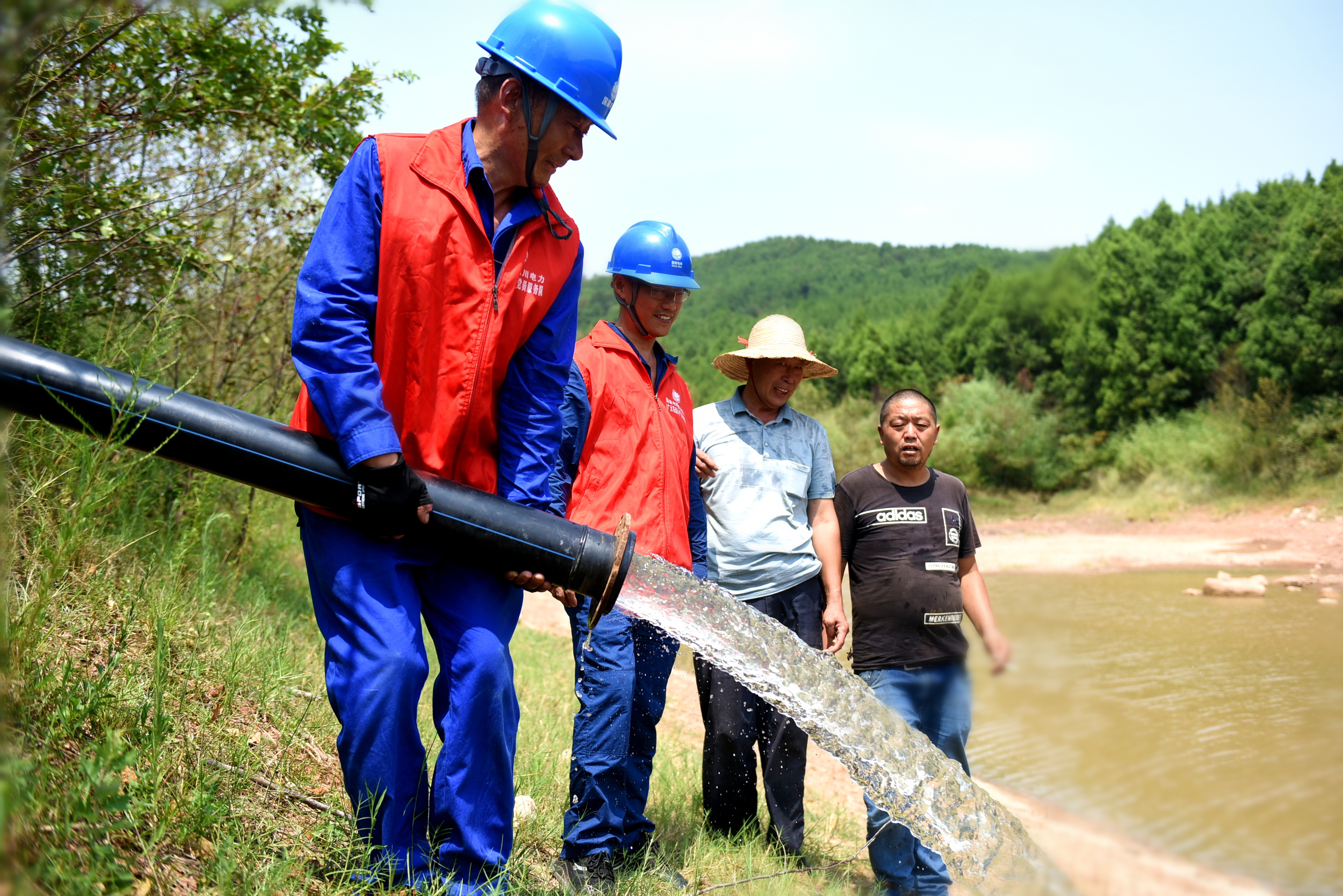 合上抽水电闸后,在抽水泵的带动下,清澈的水流从落差137米的过路塘源源不断地流入干涸的堰塘,预计5天抽满山平塘,水源将流入下游干涸的稻田,让稻田重获生机,确保秋收颗粒归仓。