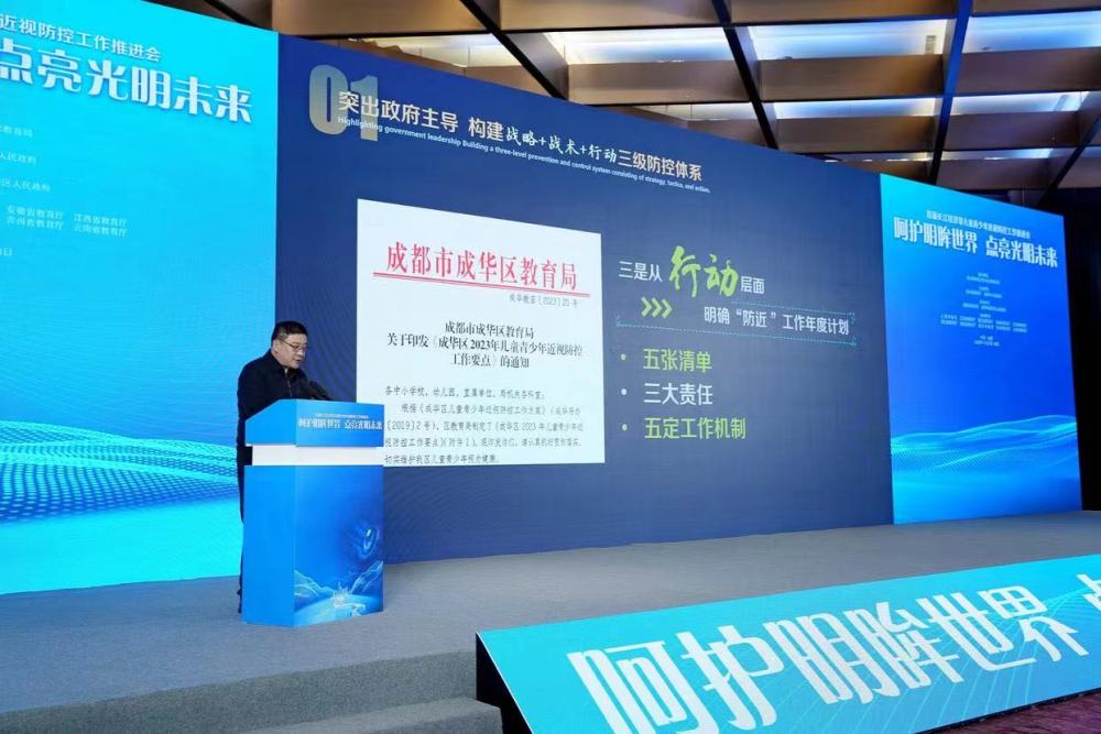 成都市成华区人民政府副区长刘虹介绍说,成华区积极探索形成儿童青少年近视防控“四个三模式”:即突出政府主导,构建“战略+战术+行动”三级防控体系;突出多方协作,织密“学校+家庭+社会”三重防控网络;突出联防联控,擦亮“教卫+教体+教科”三张防控名片;突出综合施策,强化“预检+预警+预防”三项防控机制。通过多方协作、联防联控、综合施策,努力构建具有成华特色的近视防控综合“生态圈”,促进了学生身心健康全面发展。