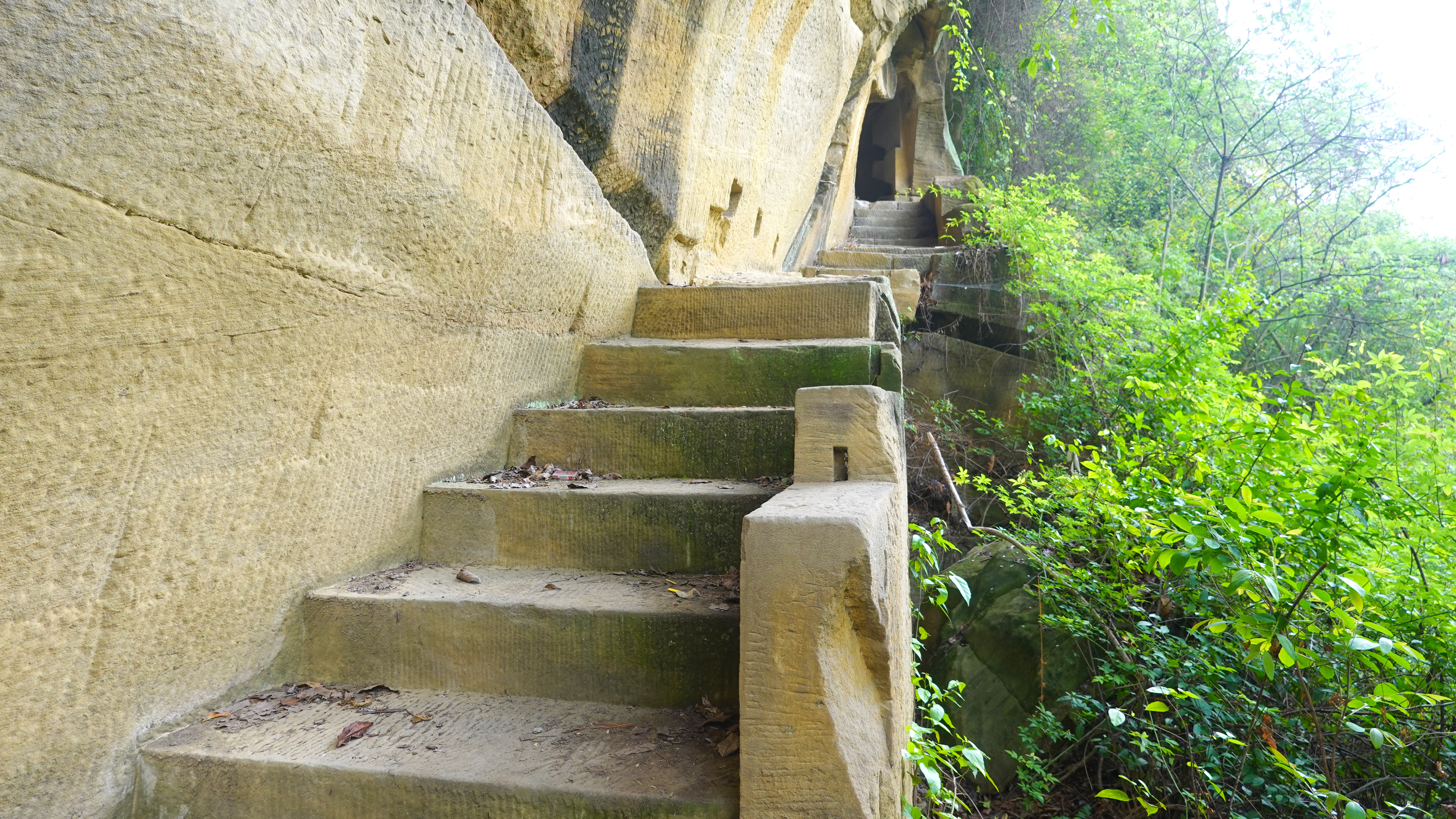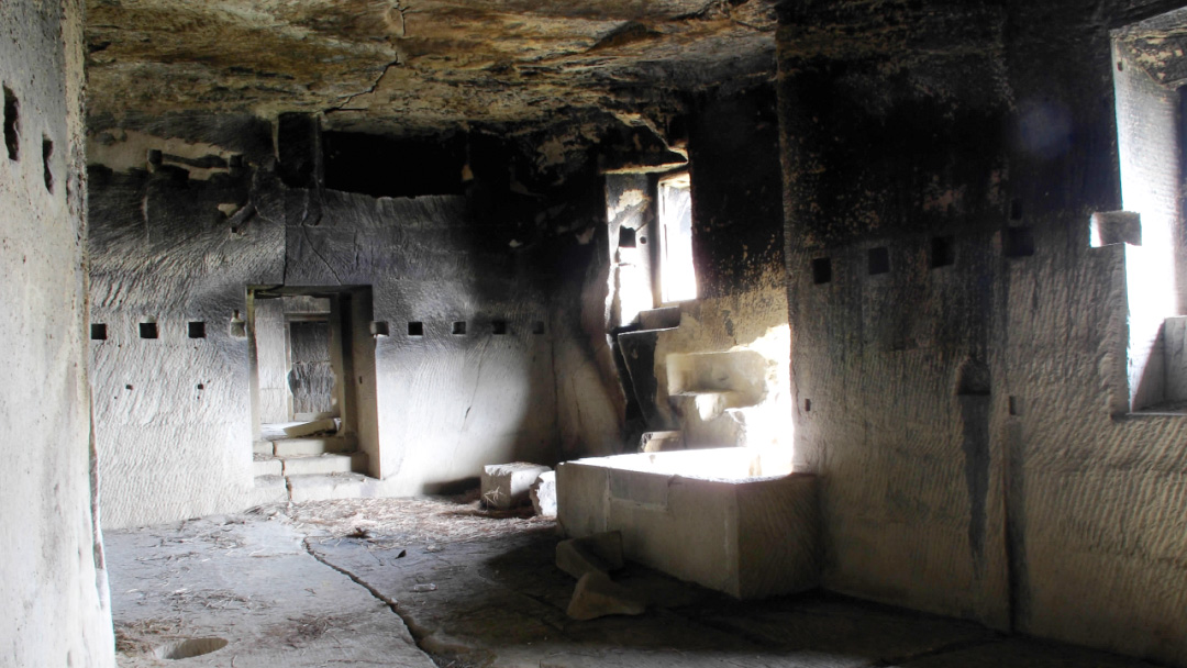 走过石梯,洞口“曲径通幽”四字,指示着前方路途的神秘幽深。穿过山洞,砦内主体石室便展现在眼前,石室原分三层,高约6米。从洞口望下去,山间房舍、林木尽收眼底。