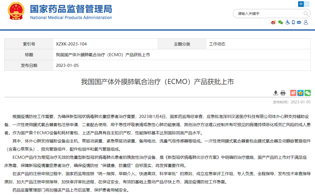 1月5日,国家药品监督管理局网站公布《我国国产体外膜肺氧合治疗(ECMO)产品获批上市》,全文如下: