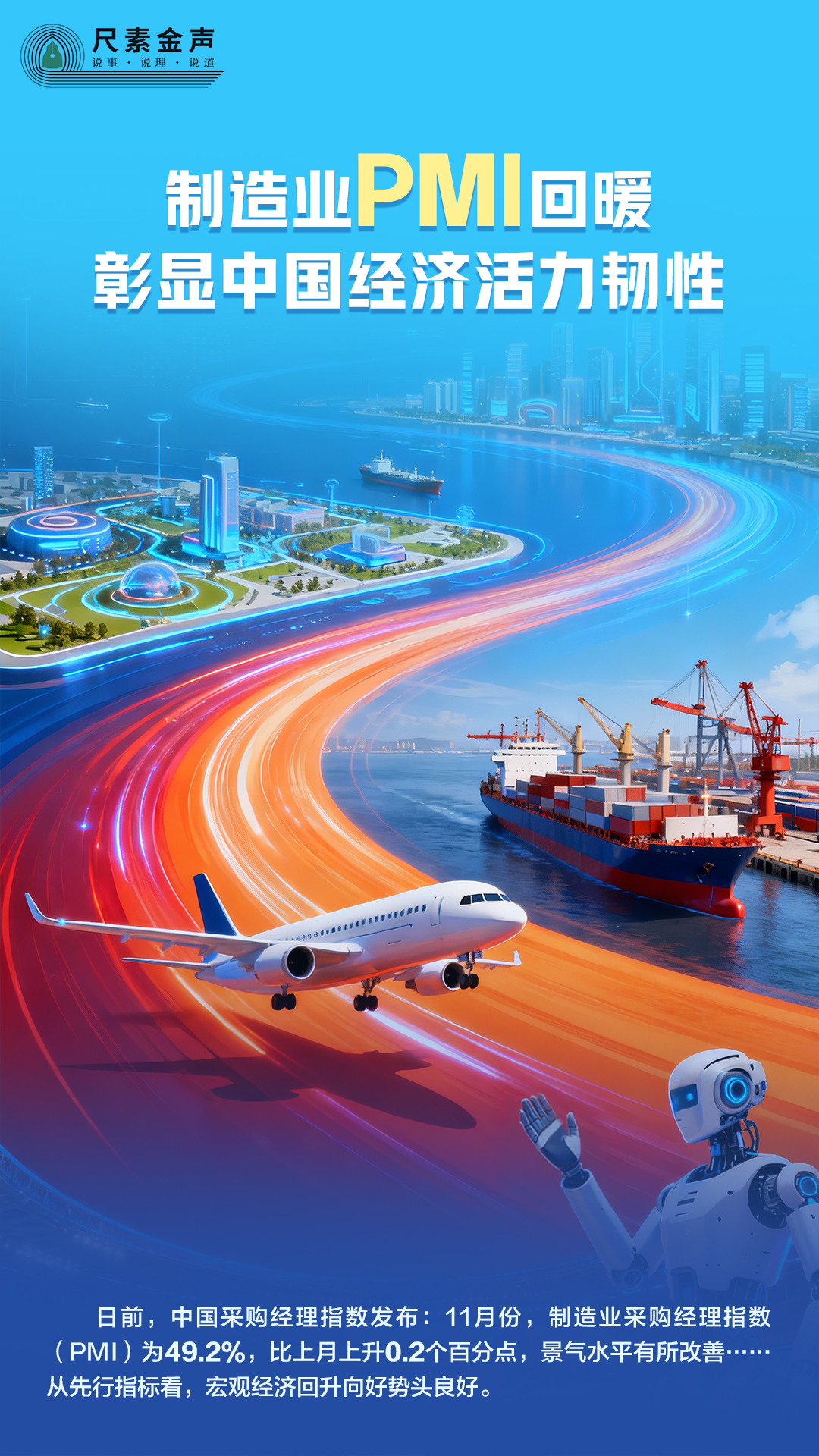 日前,中国采购经理指数发布:11月份,制造业采购经理指数(PMI)为49.2%,比上月上升0.2个百分点,景气水平有所改善……从先行指标看,宏观经济回升向好势头良好。