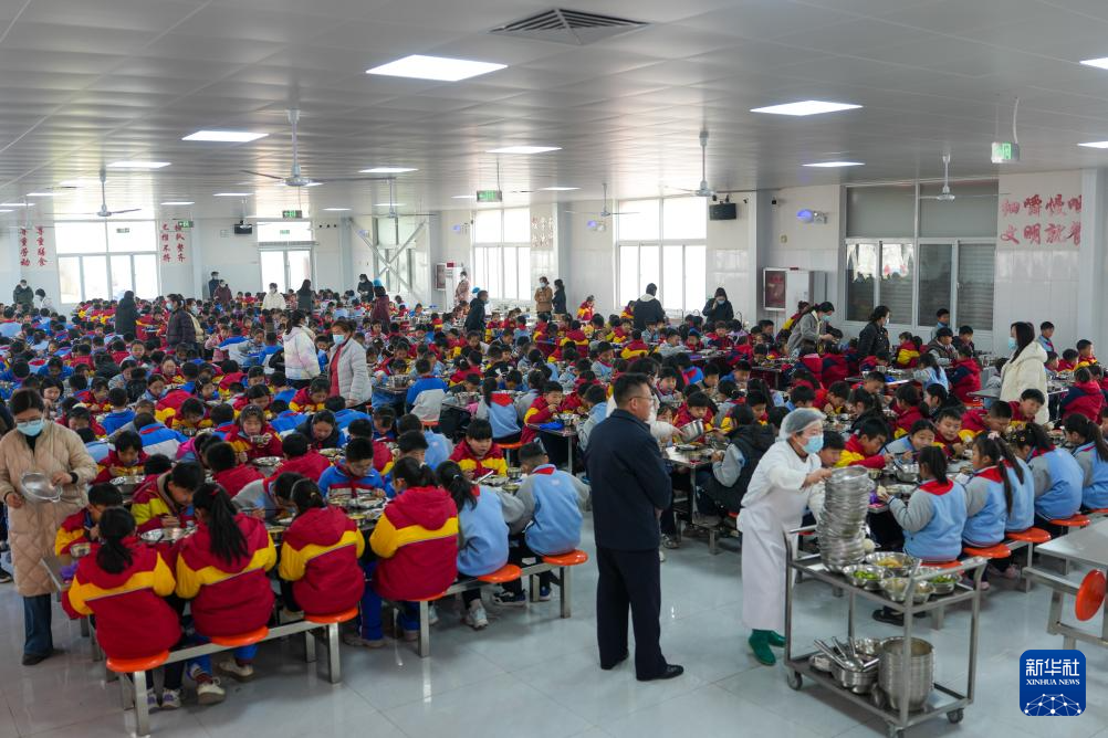 1月16日,戴庙镇中心小学餐厅内,学生们在吃午餐。新华社记者 朱峥 摄