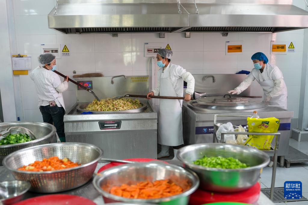 1月16日,戴庙镇中心小学餐厅内,从学生家长中招聘的工作人员在烹制午餐。新华社记者 朱峥 摄