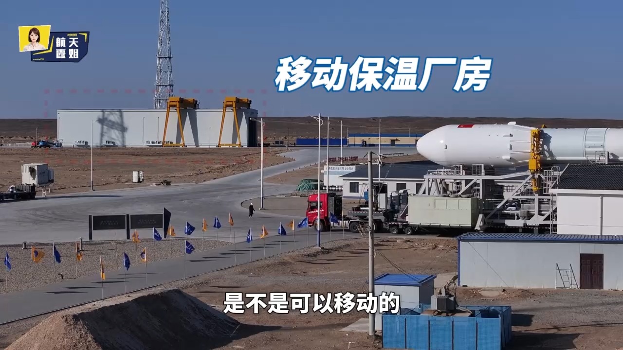 中科宇航力箭二号运载火箭总指挥 杨浩亮:移动保温厂房的一个好处就是它的机动性比较强,它可以随着火箭的位置进行前移或者后移,可以抵御所有的风沙,在平时没有火箭的情况下,还能作为一个简易的仓库来使用。保护火箭箭体有移动的保温厂房,那保护卫星的就是整流罩了。