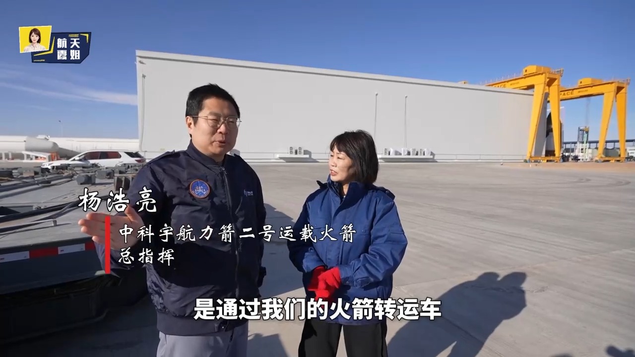 中科宇航力箭二号运载火箭总指挥 杨浩亮:火箭是通过火箭转运车从技术厂房通过8.8公里的道路,以5公里每小时到10公里每小时的速度慢慢转运而来。厂房也是一个移动保温厂房,火箭到了移动工位,倒下之后,它将不再往后移动,这个时候整个移动保温厂房向前移动。相当于人家是搬家,这里是搬房子。