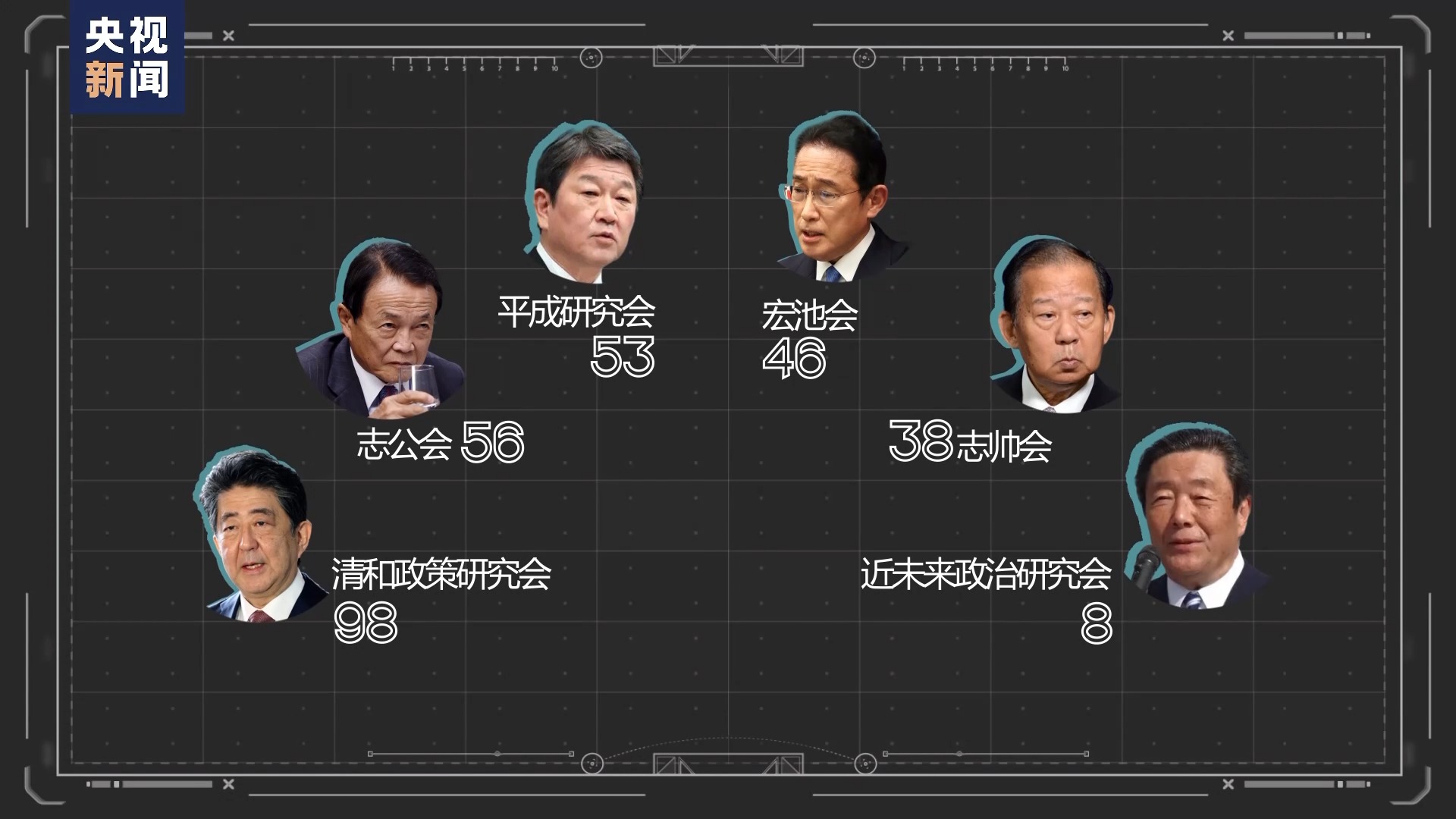 长期以来,“派阀政治”一直被视为日本自民党政治的代名词,此前,自民党内共有六大派阀:“安倍派”,清和政策研究会,有98名议员;“麻生派”,志公会,有56名议员;“茂木派”,平成研究会,有53名议员;“岸田派”,宏池会,有46名议员;“二阶派”,志帅会,有38名议员;“森山派”,近未来政治研究会,有8名议员;自民党内的无派阀议员仅有79名。