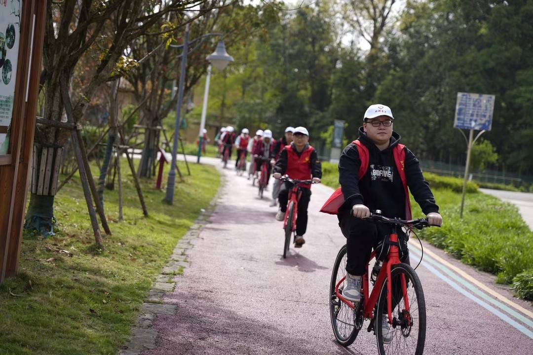 4月8日,成都市郫都区唐昌镇火花村,40余名青年志愿者参加“爱成都 迎大运”绿道骑行活动,科普垃圾分类知识。