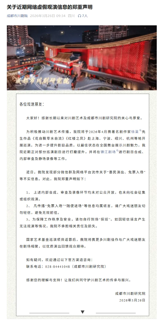 3月26日,成都市川剧研究院发布声明称,该院将于2026年4月携著名剧作家徐棻先生作品《花自飘零水自流》《红楼之凤》赴上海、宁波、绍兴、杭州等地开展巡演,近期该院正对部分巡演剧目进行打磨提升,并将在锦江剧场进行剧目合成、内部审查及静场录像等工作。上述内部合成、审查及录像环节均未对公众开放,也未向社会征集或组织观演。凡传播“免票入场”“随便进场”等信息均属谣言,请广大戏迷朋友切勿轻信,避免无效前往。