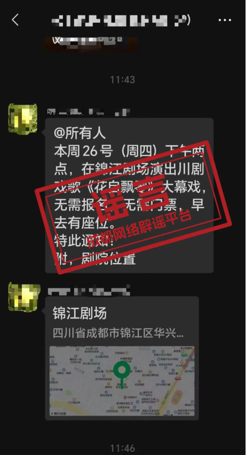 近期,一则“在锦江剧场观看川剧《花自飘零》演出无需报名、无需门票、早去有座位”的信息在社群渠道传播,并配有剧场定位,引发部分戏迷关注,误导戏迷前往。