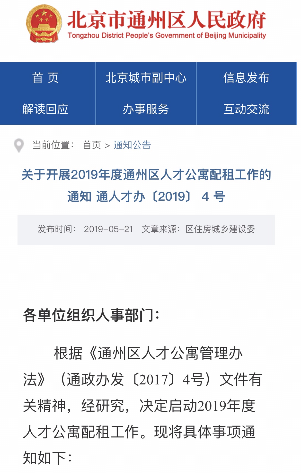 5月21日晚,封面新闻从北京市通州区住房城乡建设委获悉,《关于开展2019年度通州区人才公寓配租工作的通知》(下文简称《通知》)已公布,这意味着被称为北京城市副中心的通州已拉开人才公寓配租申请序幕。