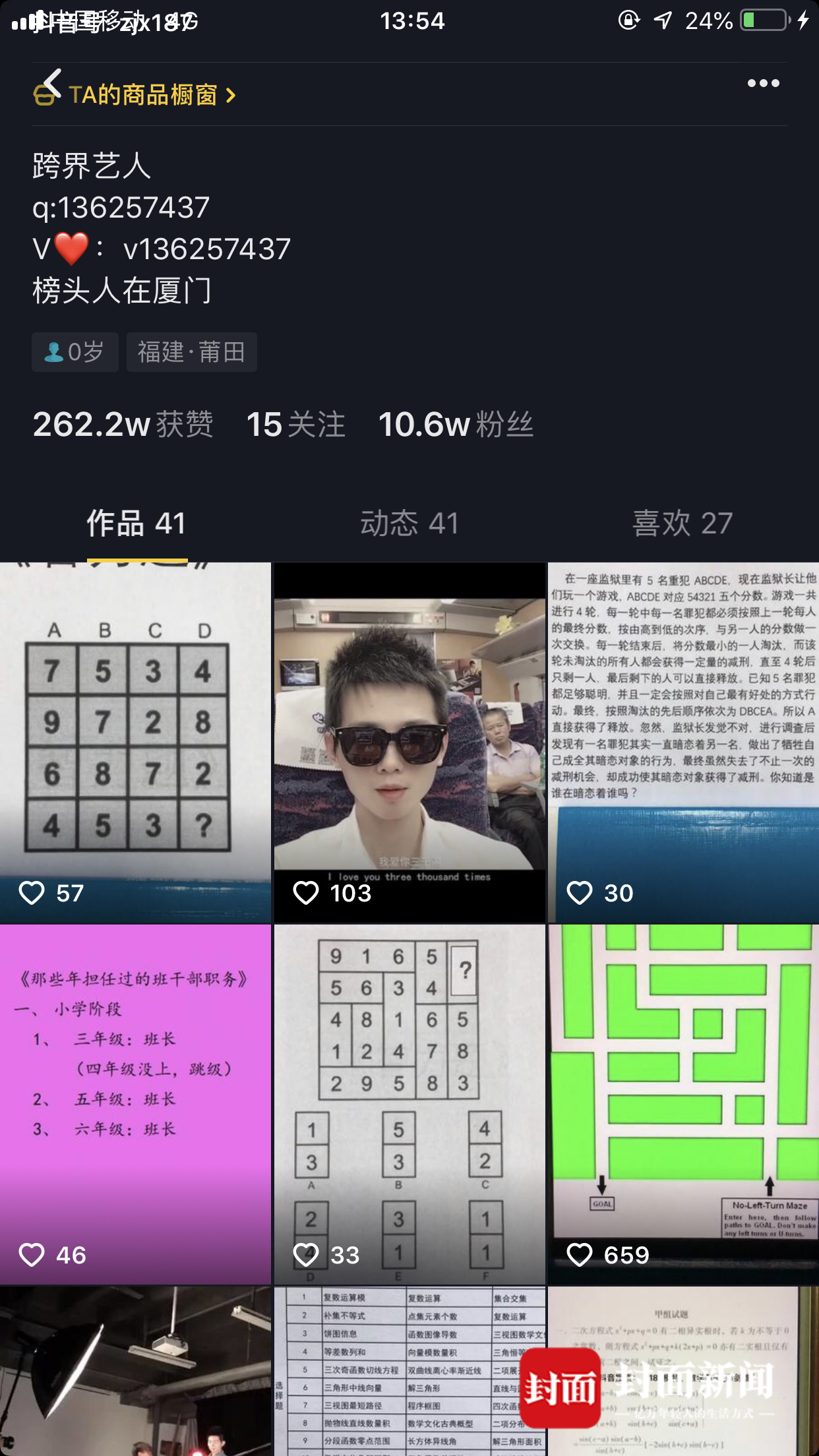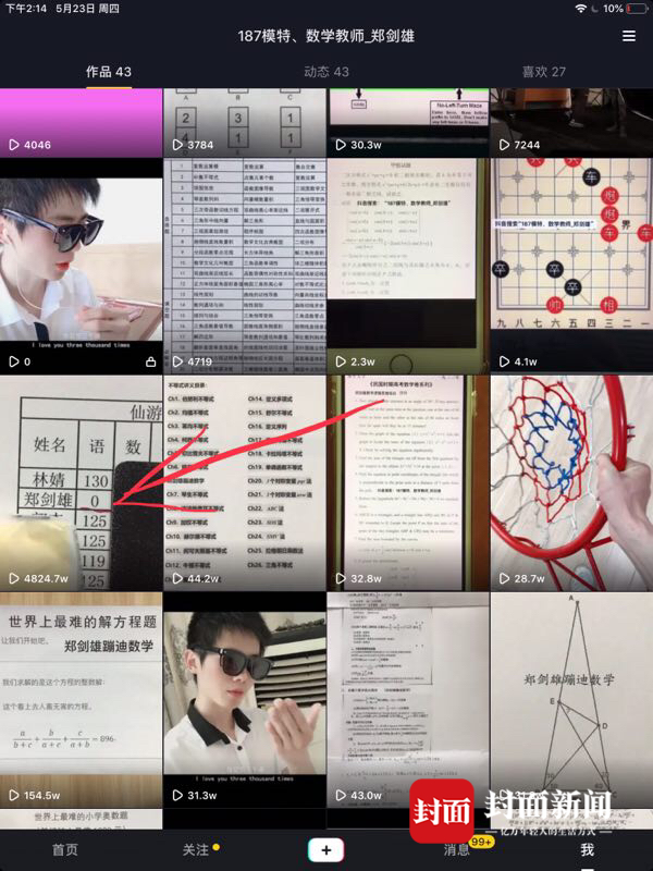 有一个工作的关系,他加了很多培训群和解题群,自己也在抖音上发布过解题的视频,人气颇高。郑剑雄称,前段时间他在某个群里看到了这段成绩单的视频,觉得有趣就存了下来。结合自己在抖音和微博的账号,他发布了该视频,没想到一夜之间火了。“网上流传的有好几段,我用的是黑色纸板遮挡的那段,感觉成绩一点点露出来有悬念有意思点。”