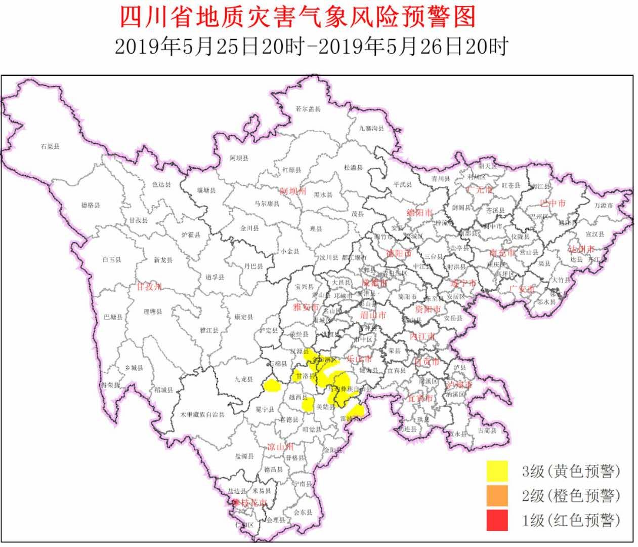 5月25日,四川省自然资源厅发布全省最新地质灾害气象风险预警,5月25日20:00~5月26日20:00,全省地质灾害气象风险预警为3级黄色预警,具体预警区域包括雅安市汉源县,乐山市金口河区、马边县、峨边县,凉山州甘洛县、越西县、冕宁县、美姑县、雷波县。