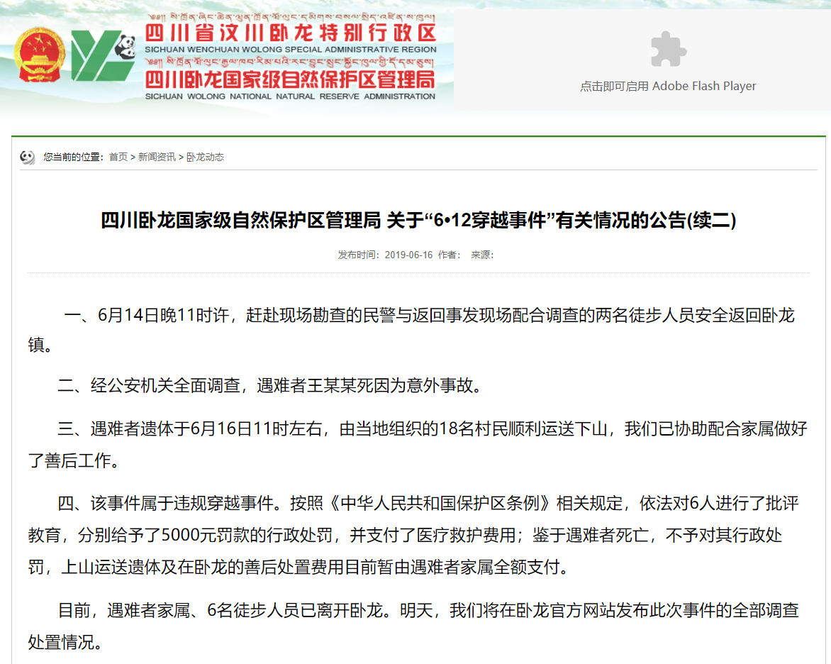 6月16日,四川卧龙官方再次就驴友穿越事件发布通报,通报称女驴友王某某之死为意外事故,剩余6名驴友被罚款五千。