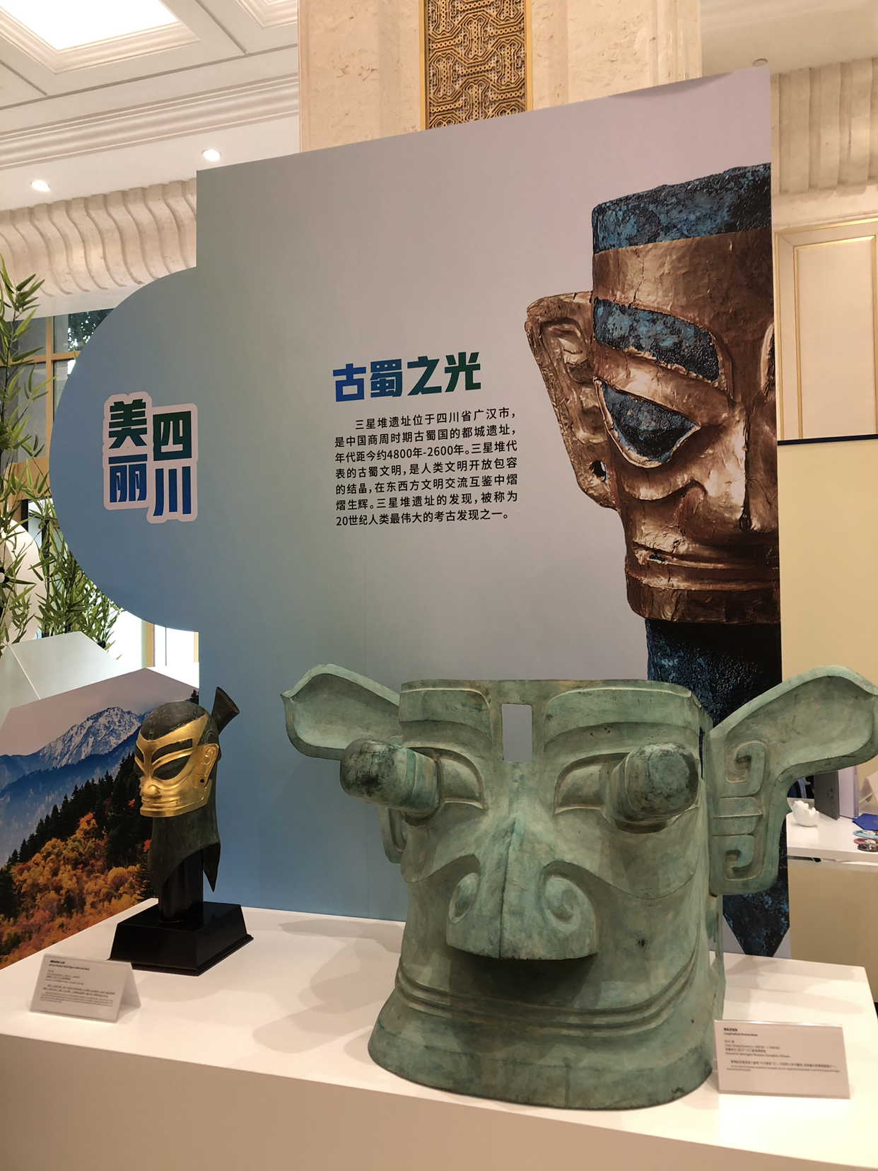 除了新机场之外,四川的传统元素也在国务院新闻办亮相,以回锅肉和麻婆豆腐代表的四川美食、竹叶青为代表的四川茶叶、三星堆铜纵目所代表的古蜀文化、绵竹木版年画和青神竹编所代表的四川非物质文化遗产都吸引了不少记者和来宾的注意。