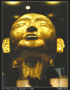金沙遗址就曾出土了两件3000年前的黄金面具——一件小巧玲珑的金面具,器高3.7厘米、宽4.9厘米、厚0.01厘米至0.04厘米、重5克,圆脸圆颐,双眼、大嘴镂空,鼻梁高直,嘴形似乎还略呈笑意,富有极其神秘的色彩;另一件金面具形体较大,宽19.5厘米、高11厘米、厚0.04厘米、重46克,是目前我国发现的同时期形体最大、保存最为完整的金面具。面部呈方形,额齐平,长刀形眉凸起,大立眼,三角形鼻高挺,有两个鼻孔,阔嘴,长方形耳朵,耳垂处各有一圆孔,下颌齐平,内折,显得十分威严。