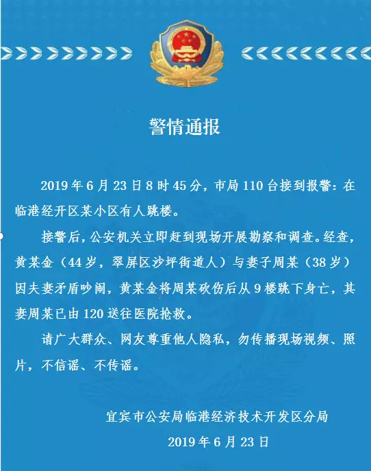 6月23日,宜宾市公安局临港经济技术开发区分局发布警情通报: 2019年6月23日8时45分,市局110台接到报警:在临港经开区某小区有人跳楼。