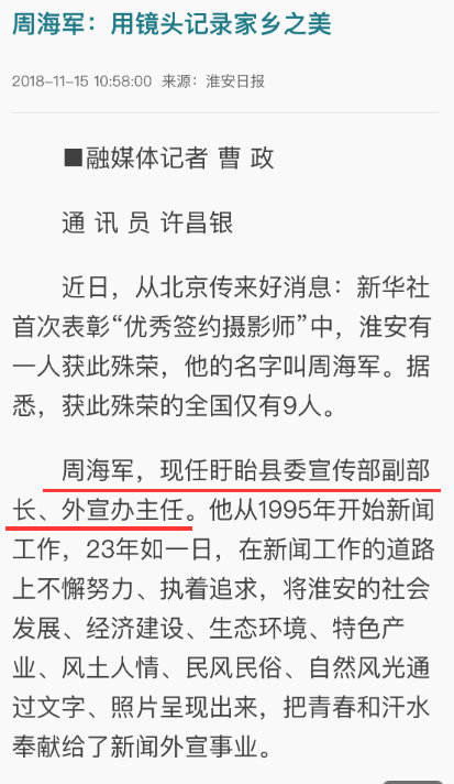 据封面新闻记者了解,周海军现任盱眙县委宣传部副部长、对外宣传办公室主任。在淮安市人民政府官网上,还刊登着署名周海军的相关摄影照片,内容多是盱眙县本地的一些人文风景照。