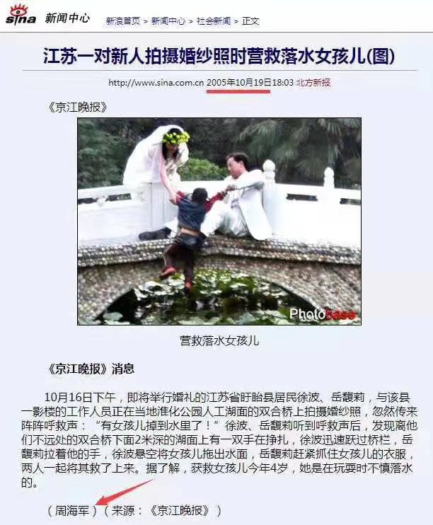 不过,火了也容易被人“挖坟”。就在照片广泛传播过后,有网友扒出,早在2005年10月19日,就有媒体发布过类似的照片,当时署名为“江苏一对新人拍婚纱照时营救落水女孩儿”,地点同为江苏盱眙县,稿件作者正是周海军。