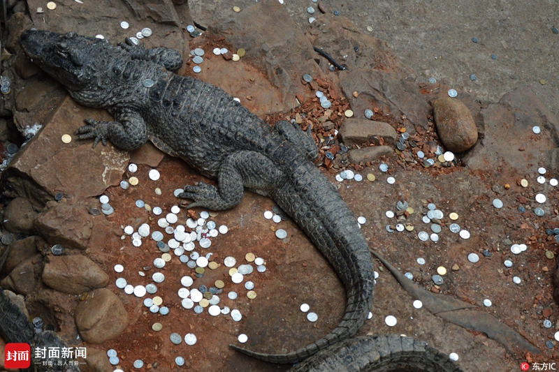 2017年1月31日,上海动物园,在扬子鳄鱼池中,被不文明游客投入多达上百枚的1元和5角硬币,扬子鳄背上也驮着硬币,动物园竟然被当做了许愿池。