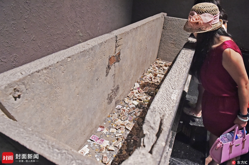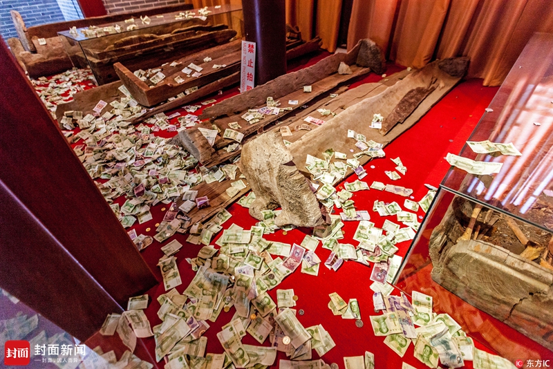 2015年9月5日,湖北省秭归县屈原故里景区屈原祠内,秭归兵书宝剑峡战国时期悬棺葬展示厅内,悬棺上游客投放的人民币堆积如小山,不见景区管理人员制止和清理。