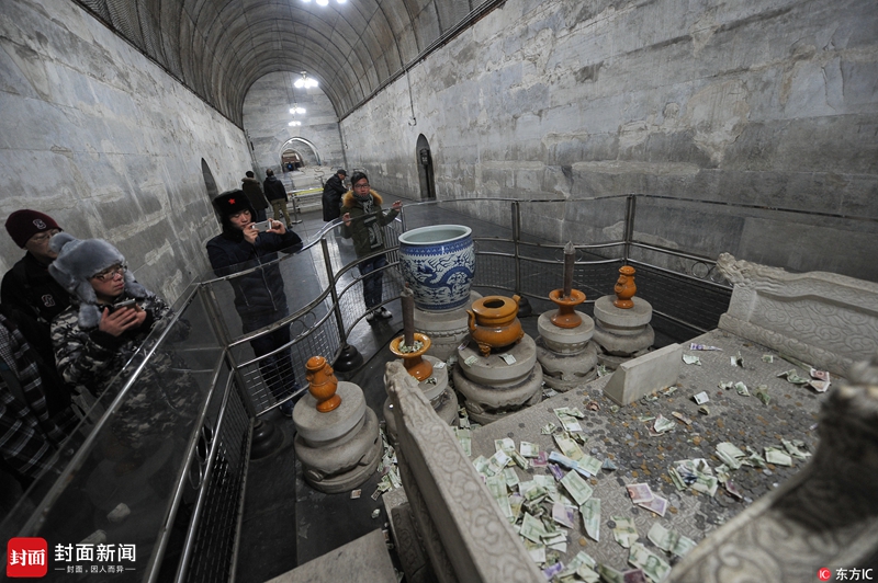 2015年12月16日,北京明十三陵定陵地宫内,万历皇帝及皇后的宝座周边被前来观赏的游客扔满了人民币用来祈福。