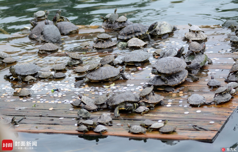 2016年5月12日,福建厦门,南普陀寺放生池大清理后一个月再现乌龟扎堆叠罗汉晒太阳。今年4月初,南普陀寺放生池因鱼龟数量太多,加上大批善男信女随意放生,使池中生物难于生存,已经进行了捕捞清理。