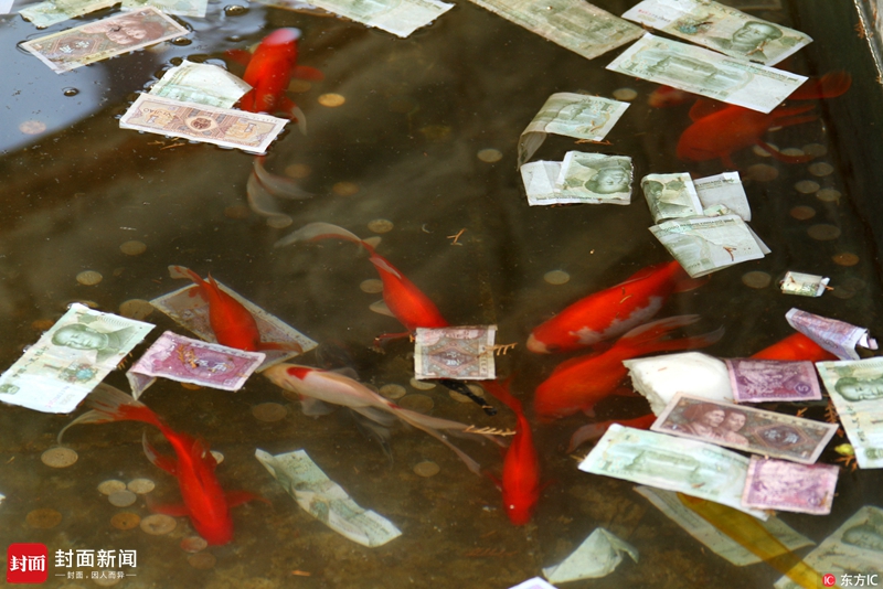 2015年10月05日,河南省洛阳市,香山寺大雄宝殿的许愿池盛满了游客投入的 “许愿钱”。池中的观赏鱼在沉底的硬币和漂浮的纸币中间游来游去,只能看不能吃。
