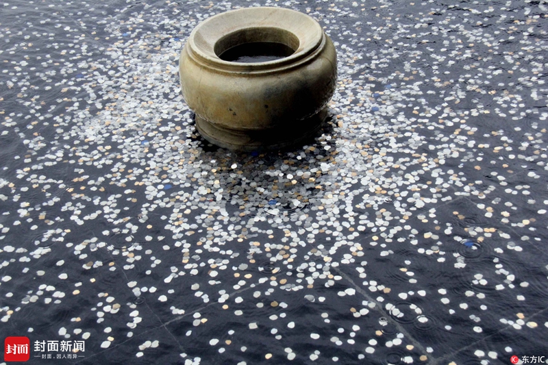 2015年4月6日,南京,侵华日军南京大屠杀遇难同胞纪念馆西侧和平公园的水池成了游客的“许愿池”,水里散落着近万枚大量和一元和五角硬币,竟还有几枚蓝色的南京地铁单程票。