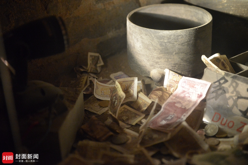 2015年5月31日,河南洛阳北邙山上的古墓博物馆内,不少墓穴内分散着一堆堆零钱和硬币,俨然被游客当作了许愿池,而多数墓穴里不仅有香烟、广告宣传页。