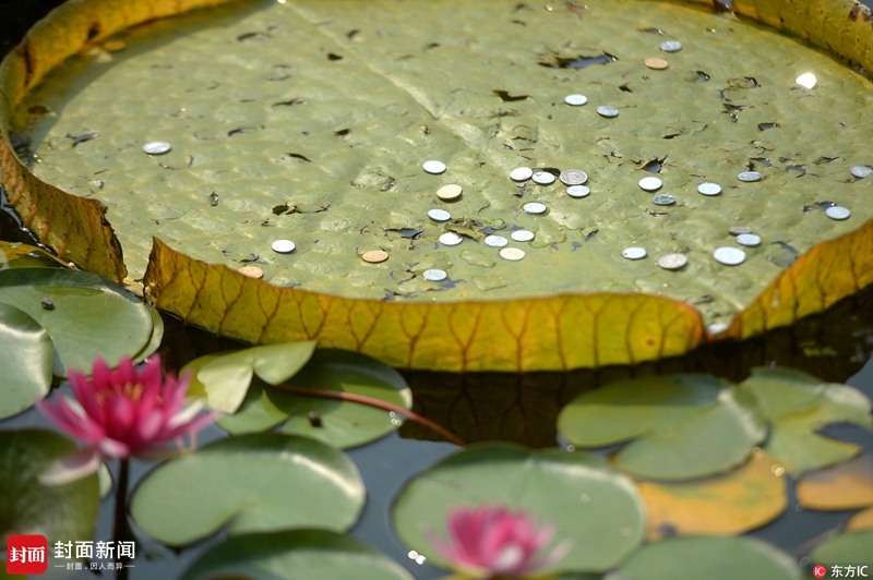 2015年8月23日,山东省济南大明湖景区北岸,有一处种植王莲的水池,盛开的王莲叶片直径达到50厘米,不少游客将王莲当成了“许愿花”,纷纷拿出硬币投向叶片,有的硬币落在叶面上,有的则砸穿叶片落入水池中,硕大的叶子上密密麻麻的布满了无数个小洞。园林工人介绍说,王莲是南美洲引进的观赏莲,在大明湖安家落户多年,今年不知何故成了游客许愿池,叶子被砸成了马蜂窝。