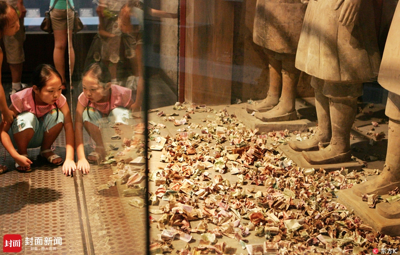 “咱们也扔点钱吧,这么多人投钱,应该能带来好运的。”这或许是许多投钱币许愿的游客的一种心理现象,就好比多年前,到景点会刻上到此一游,留下个印记。民俗专家齐守成认为,在寺庙或许愿池投币,祈福、求平安可以理解,但在其他不合时宜的地方,根本不是民俗,这种做法没有任何意义。西安陕西省历史博物馆的兵马俑前被零钞包围,前来参观的不少群众看到这种情况纷纷效仿,将1元5元人民币纷纷投向兵马俑脚下祈祷幸福。