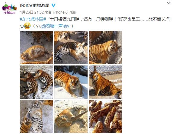 近日有一组东北虎照片在网上走红。@哈尔滨市旅游局发布了一组东北虎林园里“身材走样”的老虎照片,图片中老虎大王们一只只圆滚滚、胖都都,有如充饱气的气球,威严尽失。