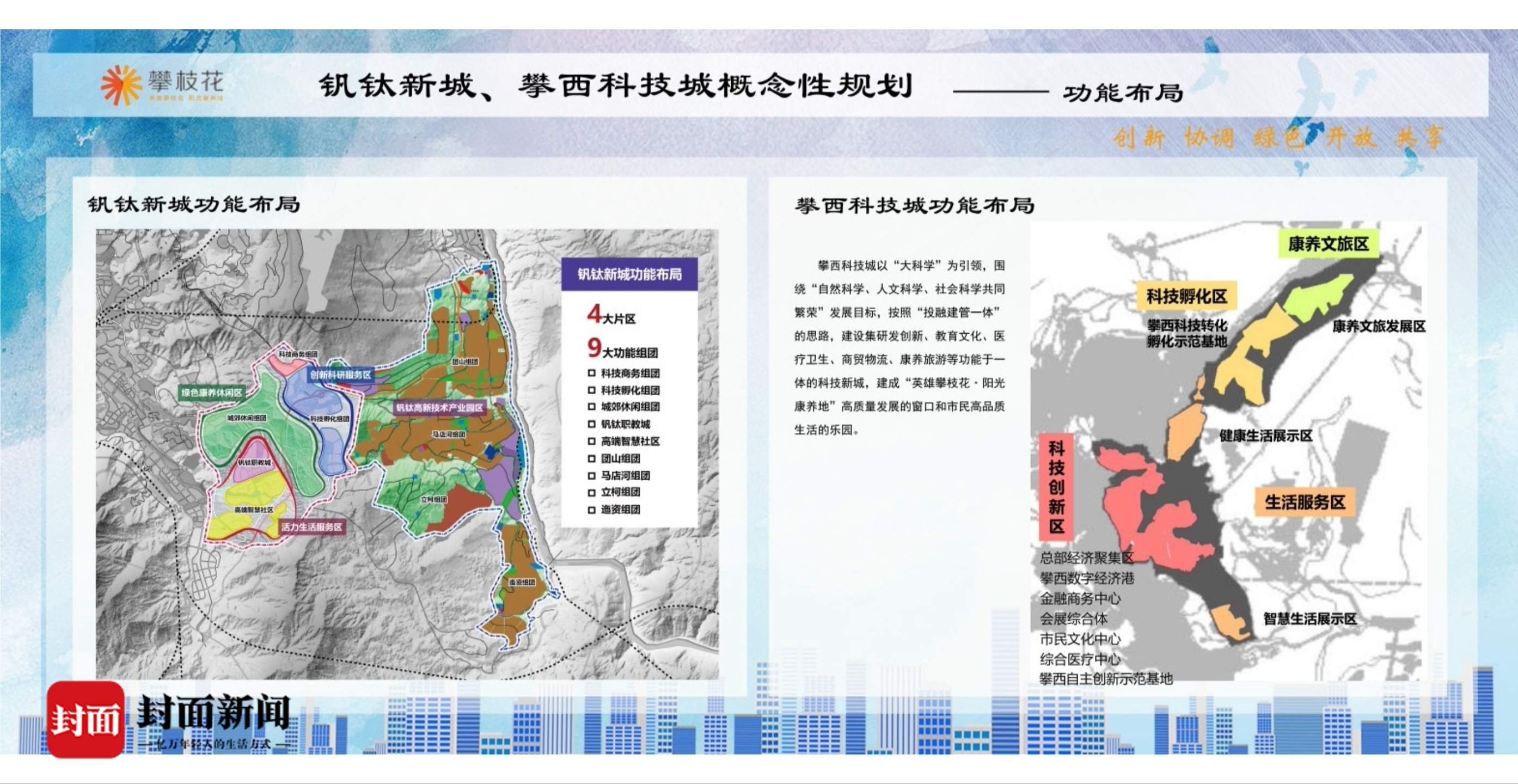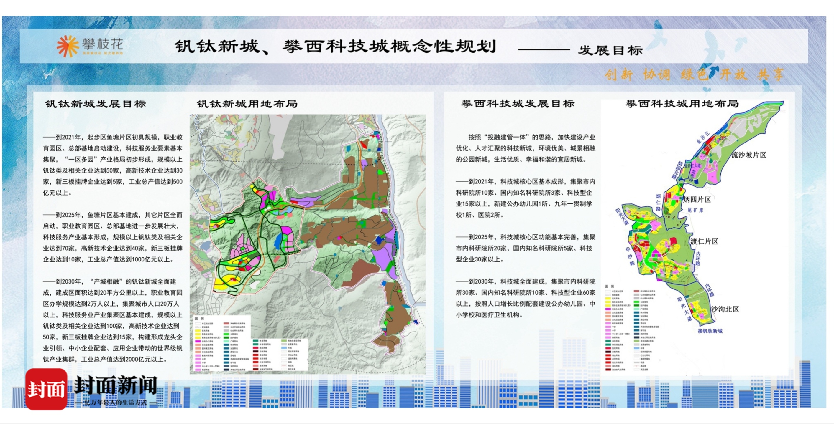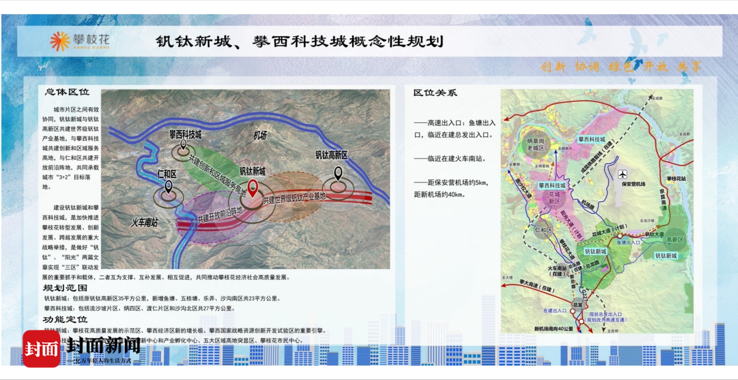 为此,攀枝花市委给予钒钛新城“三大定位”,即攀枝花高质量发展的示范区、攀西经济区新的增长极、国家战略资源创新开发试验区的重要引擎;给予攀西科技城有“三大定位”,即川西南滇西北区域科技创新中心和产业孵化中心、“五大区域高地”突显区、攀枝花市民中心。