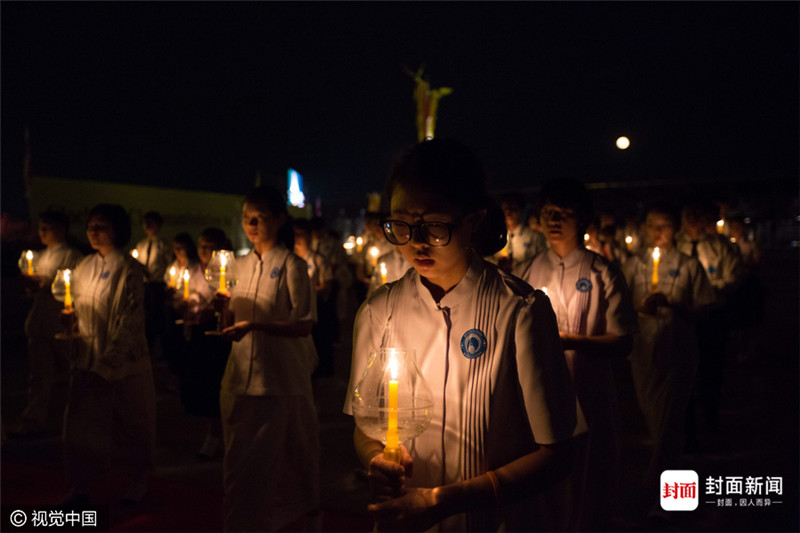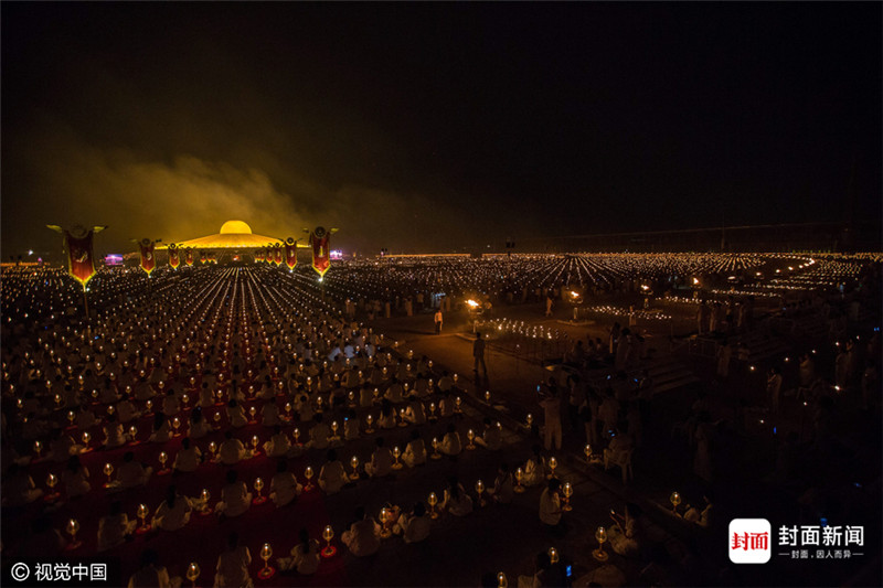 当地时间2017年2月11日,泰国曼谷北部,约1250名僧人在泰国法身寺庆祝万佛节。图/视觉中国
