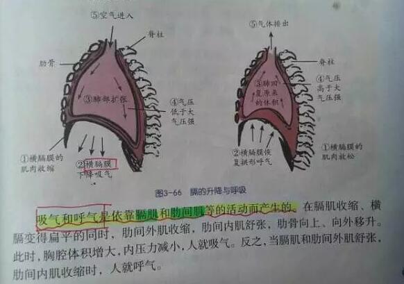 简单说,吸气和呼气是依靠膈肌和肋间肌等的活动而产生的。在膈肌收缩、横膈变得扁平的同时,肋间外肌收缩,肋间内肌舒张,肋骨向上、向外移升。此时胸腔体积增大,内压力减少,人就吸气。反之,当膈肌和肋间外肌舒张,肋间内肌收缩时,人就呼气。