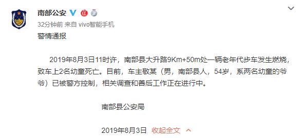 根据南部县公安局官方微博发布的警情通报,2019年8月3日11时许,南部县大升路9Km+50m处一辆老年代步车发生燃烧,致车上2名幼童死亡。目前,车主敬某(男,南部县人,54岁,系两名幼童的爷爷)已被警方控制,相关调查和善后工作正在进行中。