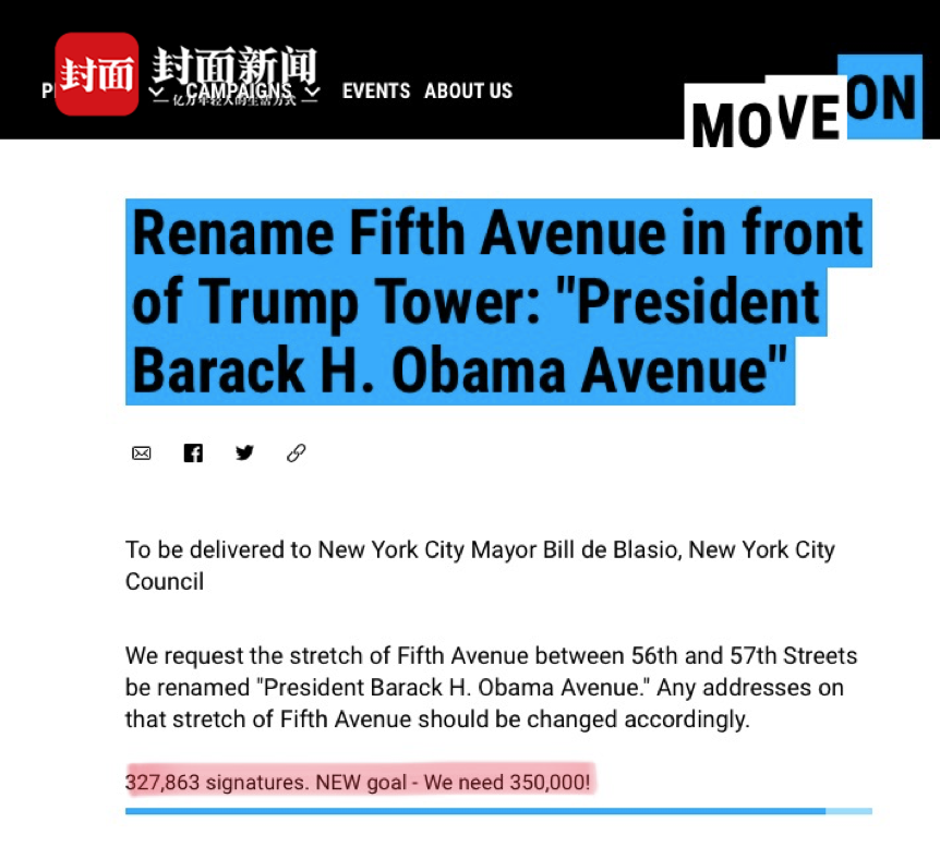 请愿书中例举了多项奥巴马执政期间的成就,包括成功消灭基地组织头目本拉登,缓解美国的经济危机等等。因此希望将纽约市第56街和第57街之间的第五大道改名为奥巴马大道。请愿书需要350000人签名,截至发稿,已有327863人签名。如果街道名称被更改,特朗普大厦的地址将成为:奥巴马大道725号。