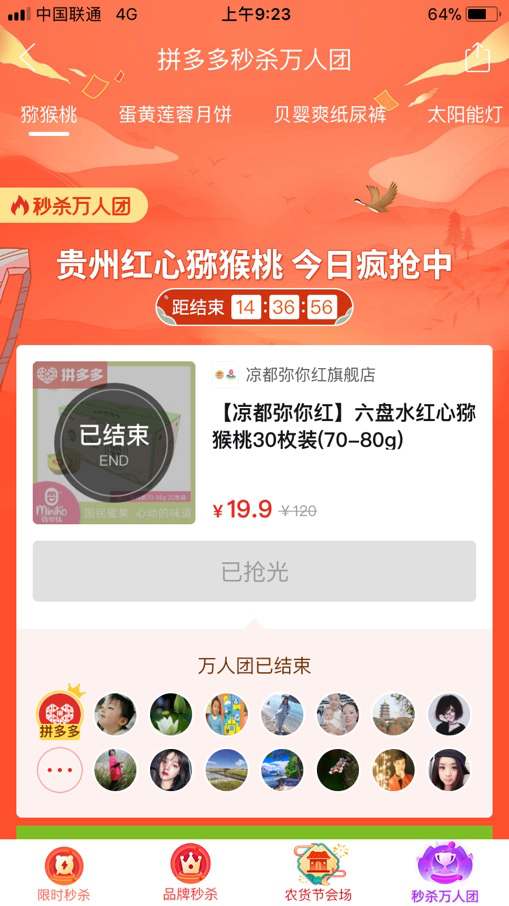 △拼多多农货节,8月19日凌晨上线的贵州六盘水红心猕猴桃,7分钟卖出3万枚,9小时22分30万枚售罄。