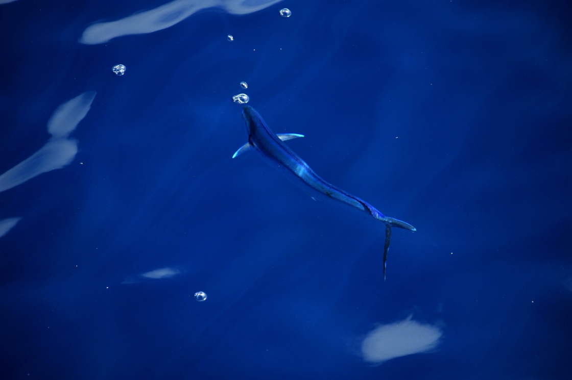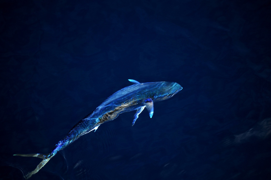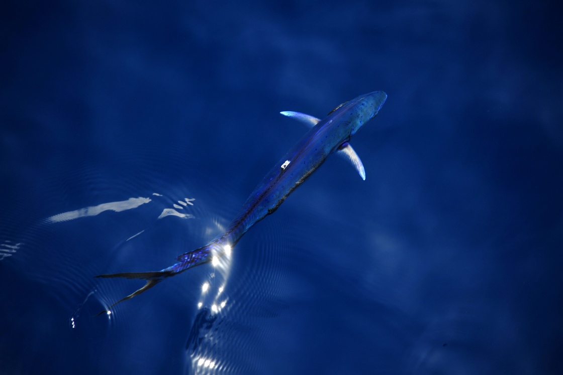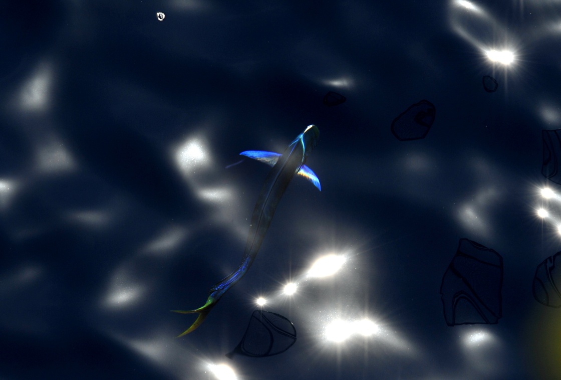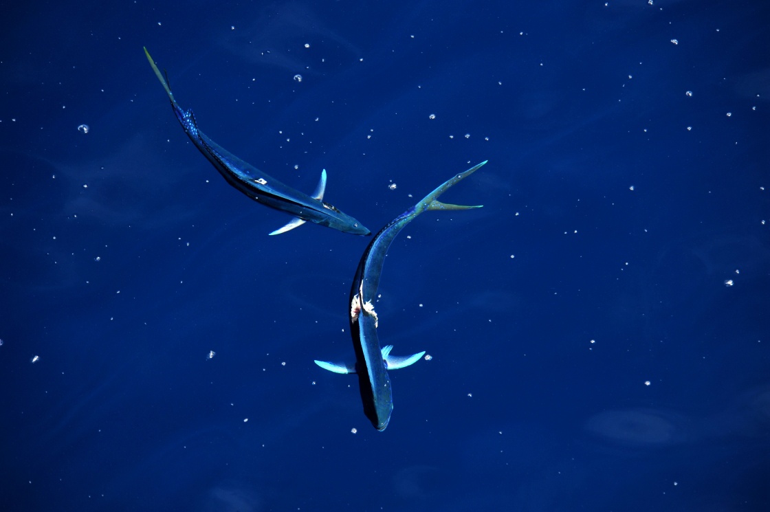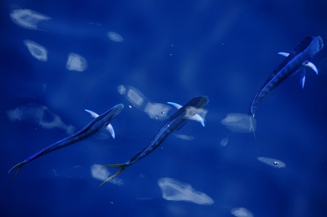 “决心”号大洋钻探船上拍摄的南海鲯鳅(2月22日摄)。2月22日,“决心”号在北纬18度、东经115度的南海北部海域,开展第三次南海大洋钻探。鲯鳅是最美丽的海洋鱼类之一,属硬骨鱼纲、鲈形目、鲯鳅科,系暖水性大洋中上层鱼类,广泛分布在热带及亚热带区海域。海明威的名著《老人与海》、李安导演的电影《少年派的奇幻漂流》中,都曾出现过这种在海水中散发出幻彩光芒的“斧头鱼”。新华社记者 张建松 摄