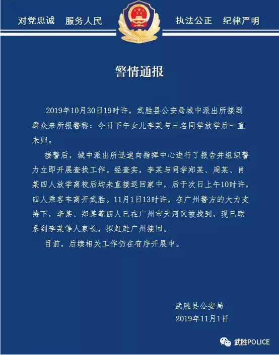 与此同时,11月1日下午三点过,武胜县公安局发布“警情通报”称,2019年10月30日许,武胜县公安局城中派出所接到群众报警称,女儿李某与三名同学放学后一直未归。