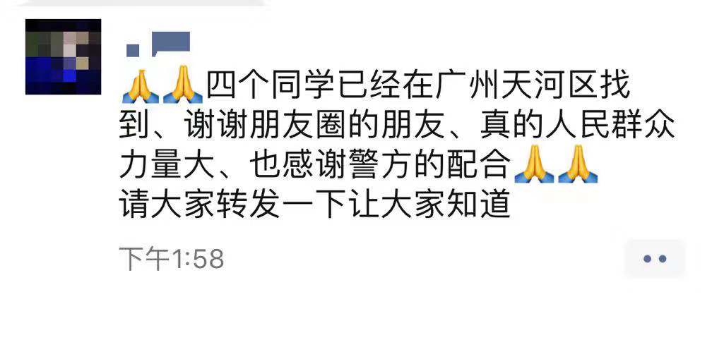 11月1日13时,四人在广州市天河区被找到,现已联系到李某等人家长,拟赶赴广州接回,后续相关工作仍再有序开展中。