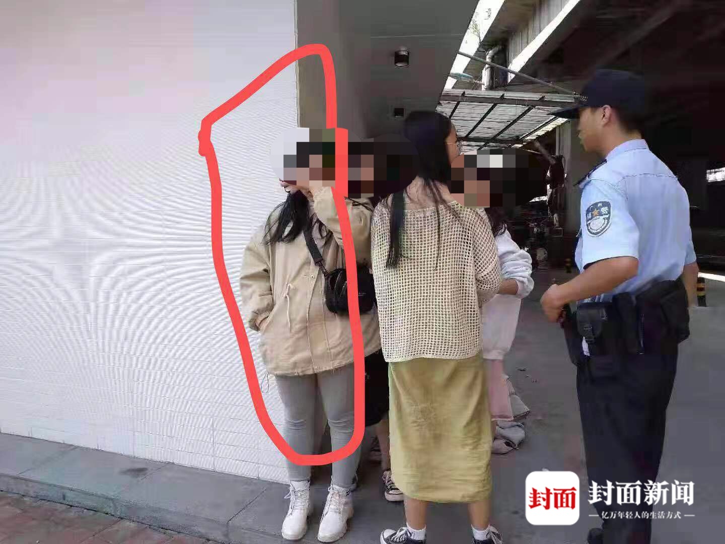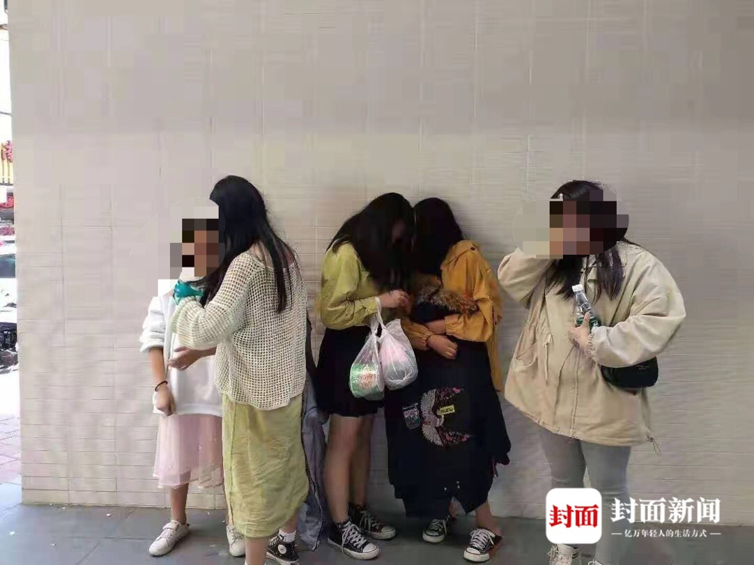 家属向封面新闻发来一张照片,内容是几名女孩背对着墙,身边的民警在询问的场景。家属告诉记者,其中一个用左手挡住自己脸部,手掌有类似纹身的女孩就是“九妹”。而在其身边,四名女孩均穿着裙子,用头发挡着脸部。