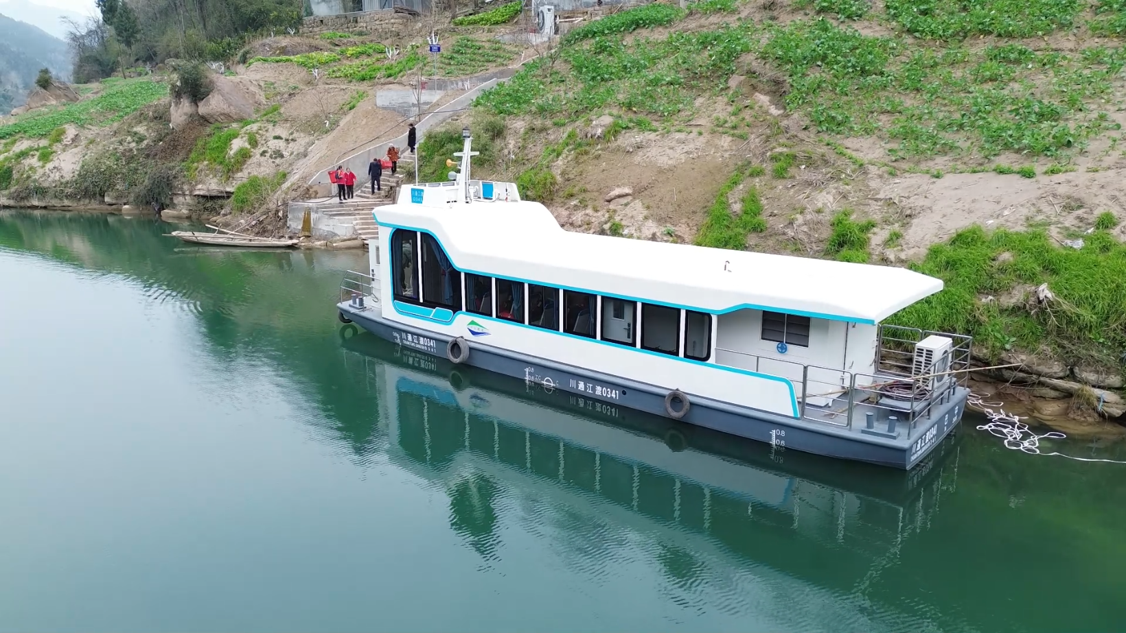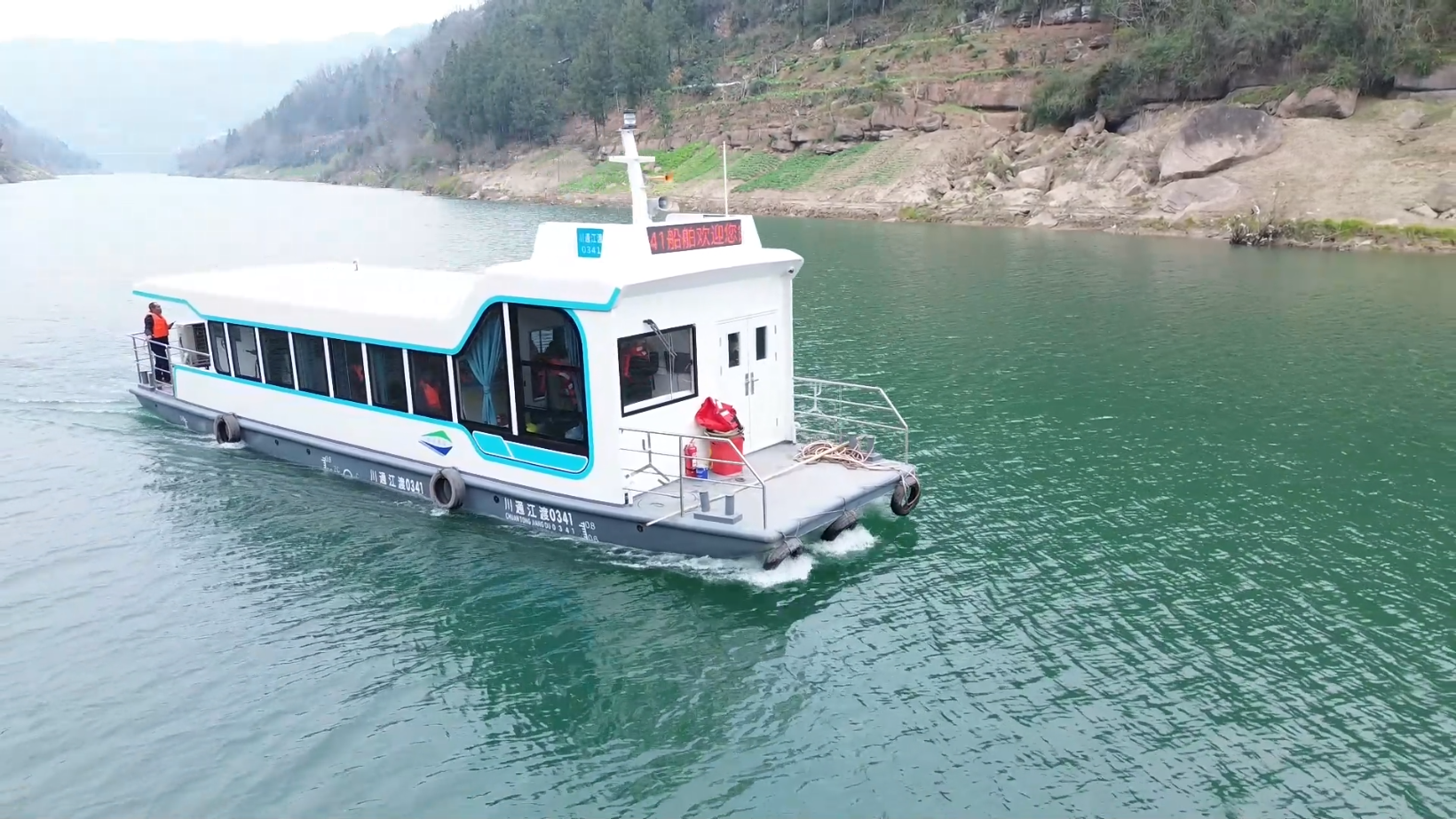 “这艘新能源渡船采用清洁能源驱动,具有噪音小、行驶稳的特点,载客量完全能满足渡口日常出行需求。”川江船舶有限公司生产负责人刘龙介绍,船身喷涂着醒目的安全标识和全省统一编号,辨识度十足;船舱内座椅整齐排列,空调、救生设备等各类配套设施一应俱全,从舒适度到安全性,全方位兼顾群众出行体验。