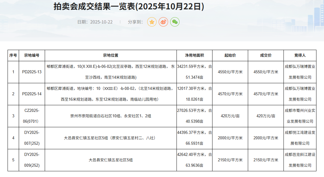 10月22日,成都有5宗土地公开拍卖,分别位于郫都区犀浦板块、崇州市及大邑县,总用地面积约239.6亩。最终均成功出让,其中郫都区两宗相邻地块由成都弘万瑞博置业发展有限公司(万科&成都菁弘联合体)竞得。