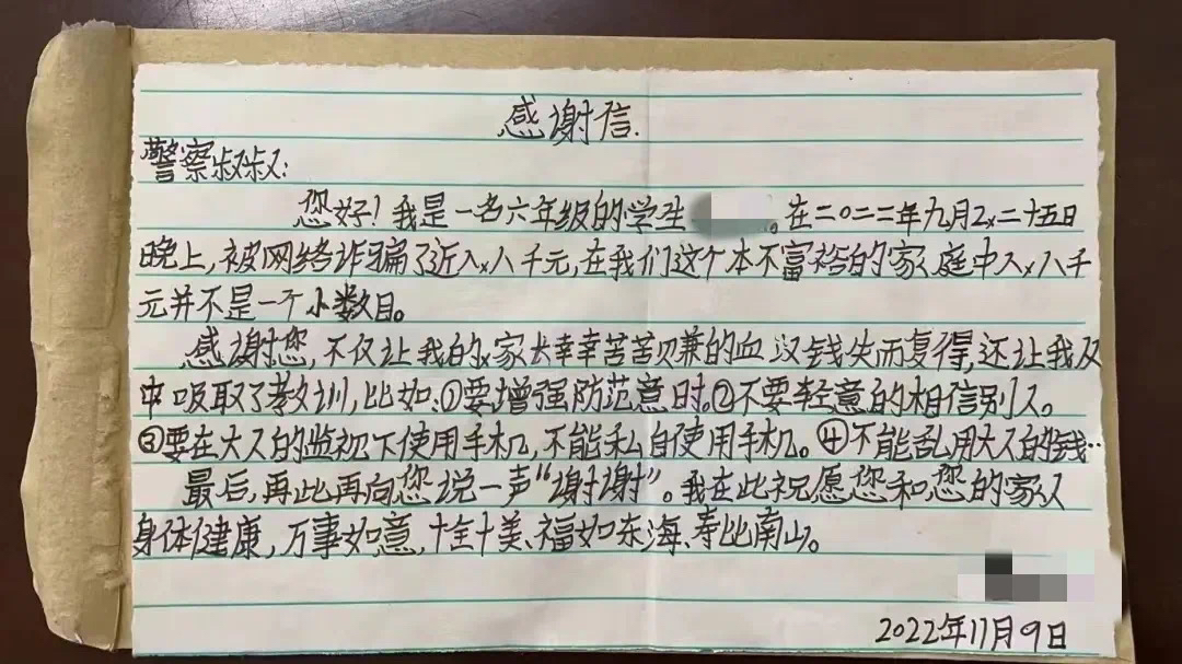 “小孩子不懂事,真没想到这被骗得钱还能这么快追回来,感谢公安机关为民解忧,为民服务的精神。太谢谢你们了。”小女孩向民警说。