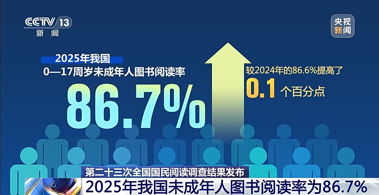 2025年我国0—17周岁未成年人图书阅读率为86.7%,较2024年的86.6%提高了0.1个百分点。人均图书阅读量为11.72本,较2024年的11.65本增加了0.07本。2025年我国0—17周岁未成年人每天阅读纸质图书36.82分钟,高于2024年的36.30分钟。