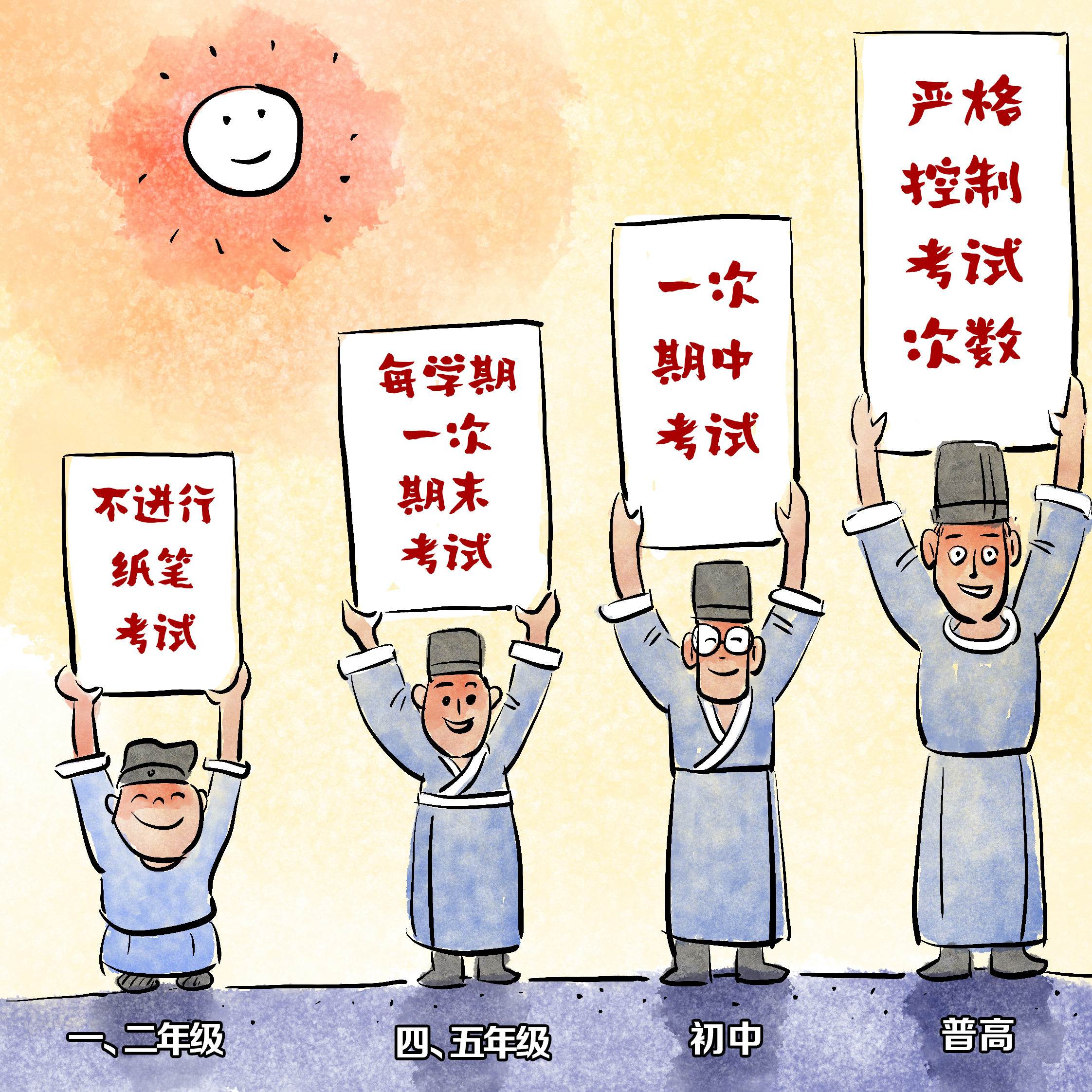 5、小学一二年级不进行纸笔考试,义务教育其他年级由学校每学期组织一次期末考试,初中年级从不同学科的实际出发,可适当安排一次期中考试。普通高中学校要严格控制考试次数。