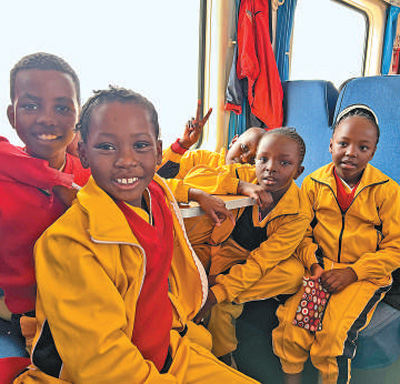 蒙内铁路是中国与肯尼亚共建“一带一路”标志性工程。图为肯尼亚学生高兴地乘坐列车出行。 本报记者 张志文摄